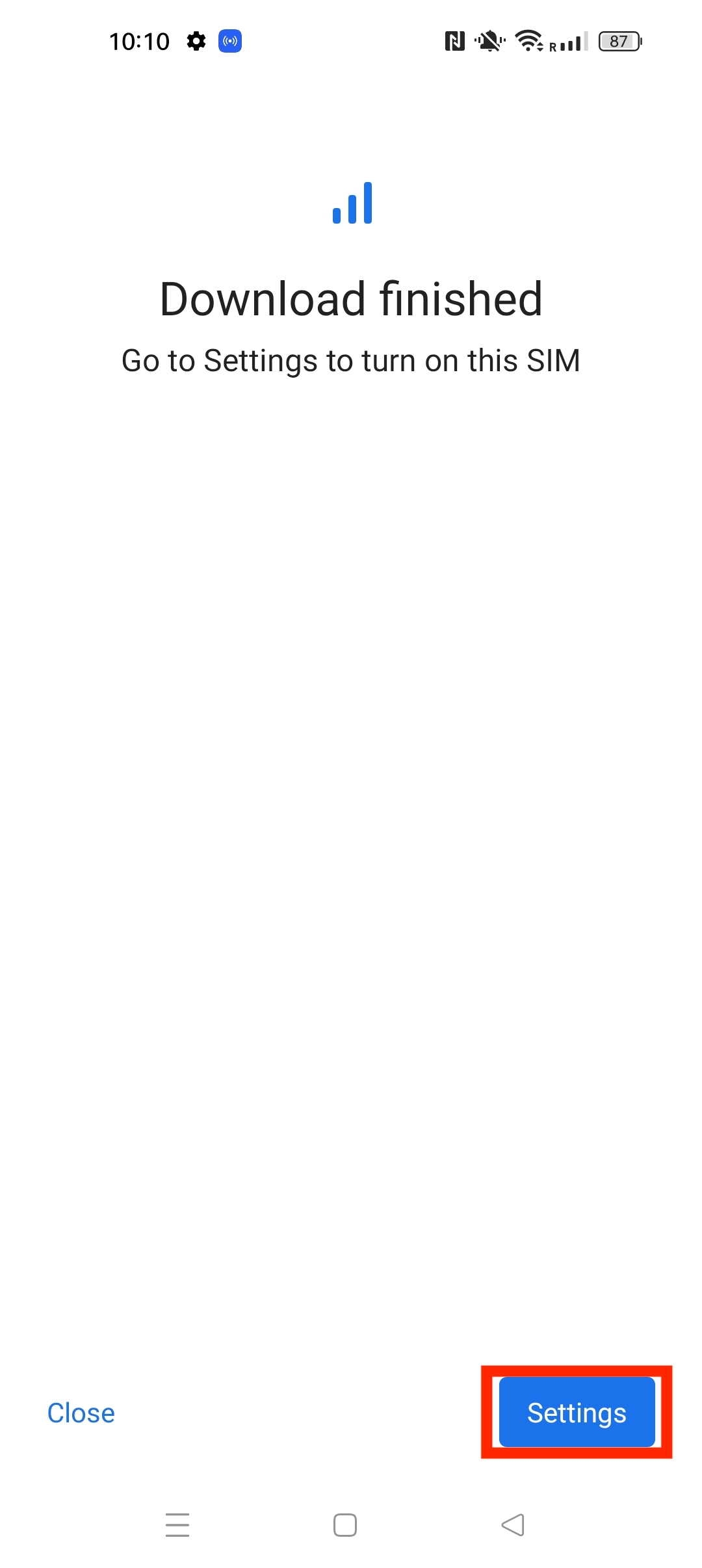 8. Wait for the eSIM to be installed. > Press "Settings".