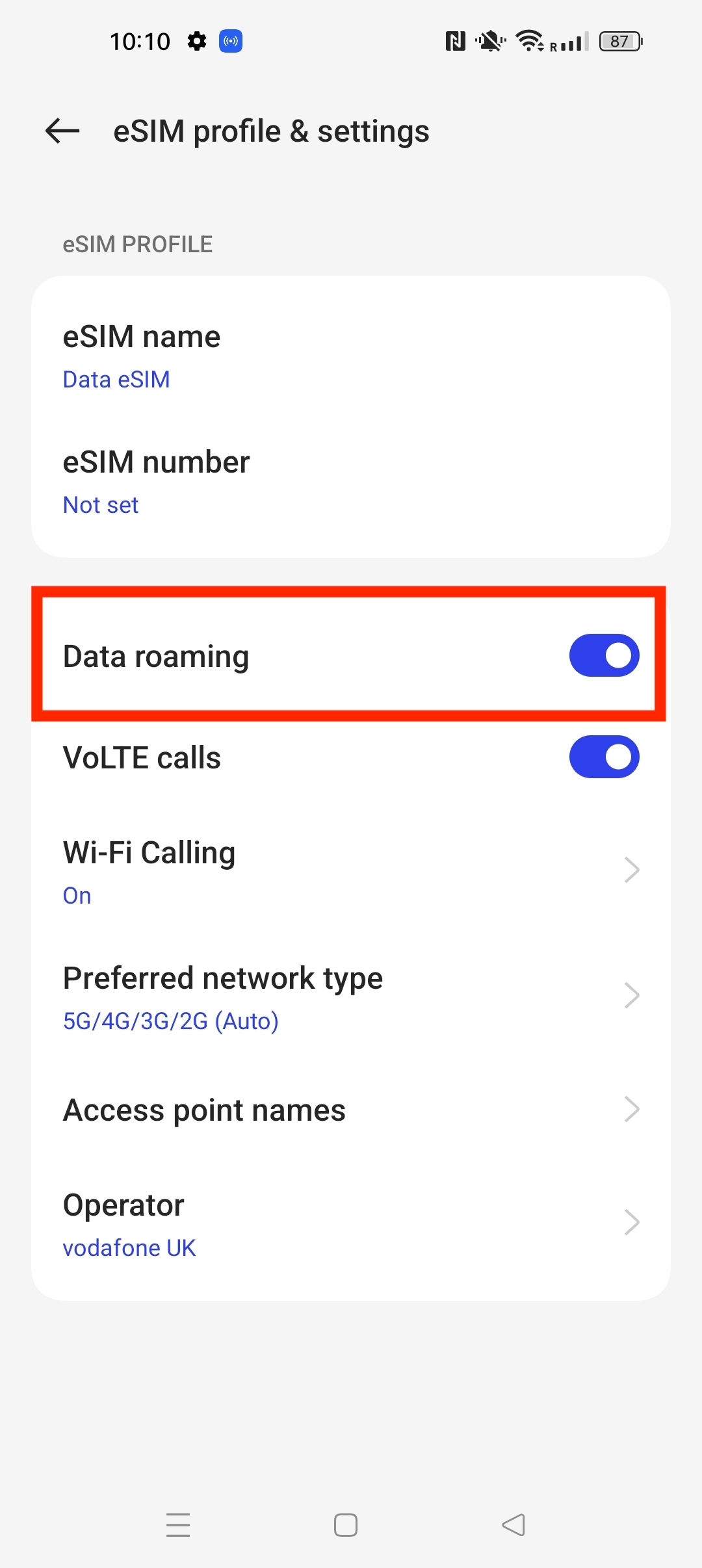 10. Make sure your Data roaming is on, or the eSIM will not work. You can do this by Going back into Mobile Network > Data eSIM.